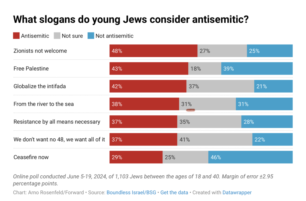 El estudio, realizado por el grupo de defensa pro-Israelí Boundless Israel, incluía un análisis detallado de los eslóganes que los judíos consideran antisemitas, y me intriga especialmente la división de opiniones sobre "Palestina Libre", que casi la misma cantidad de jóvenes judíos consideró antisemita y la misma cantidad que no lo fue. Esto es significativo porque es mucho más frecuente que otras frases que contaron con muchos menos defensores judíos, como "Sionistas no bienvenidos" y "globalizar la intifada". Además, los grupos pro-israelíes a menudo la describen como una forma abreviada de decir "la eliminación de Israel".